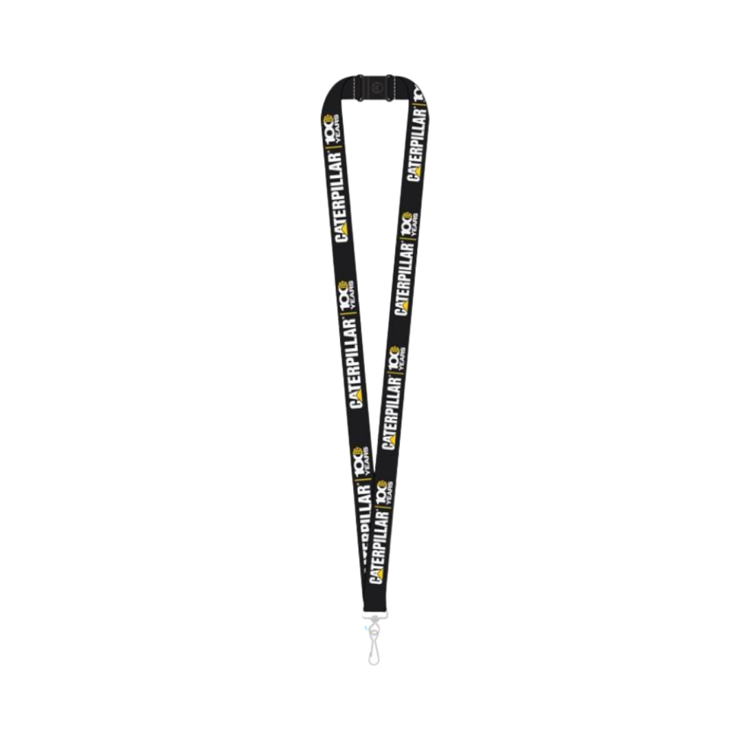 This black lanyard features the Caterpillar 100-year logo in two-colour screen print, repeated along its length. Measuring 1” by 36”, it includes a safety breakaway feature, a J-hook, and a swivel for secure and convenient use.