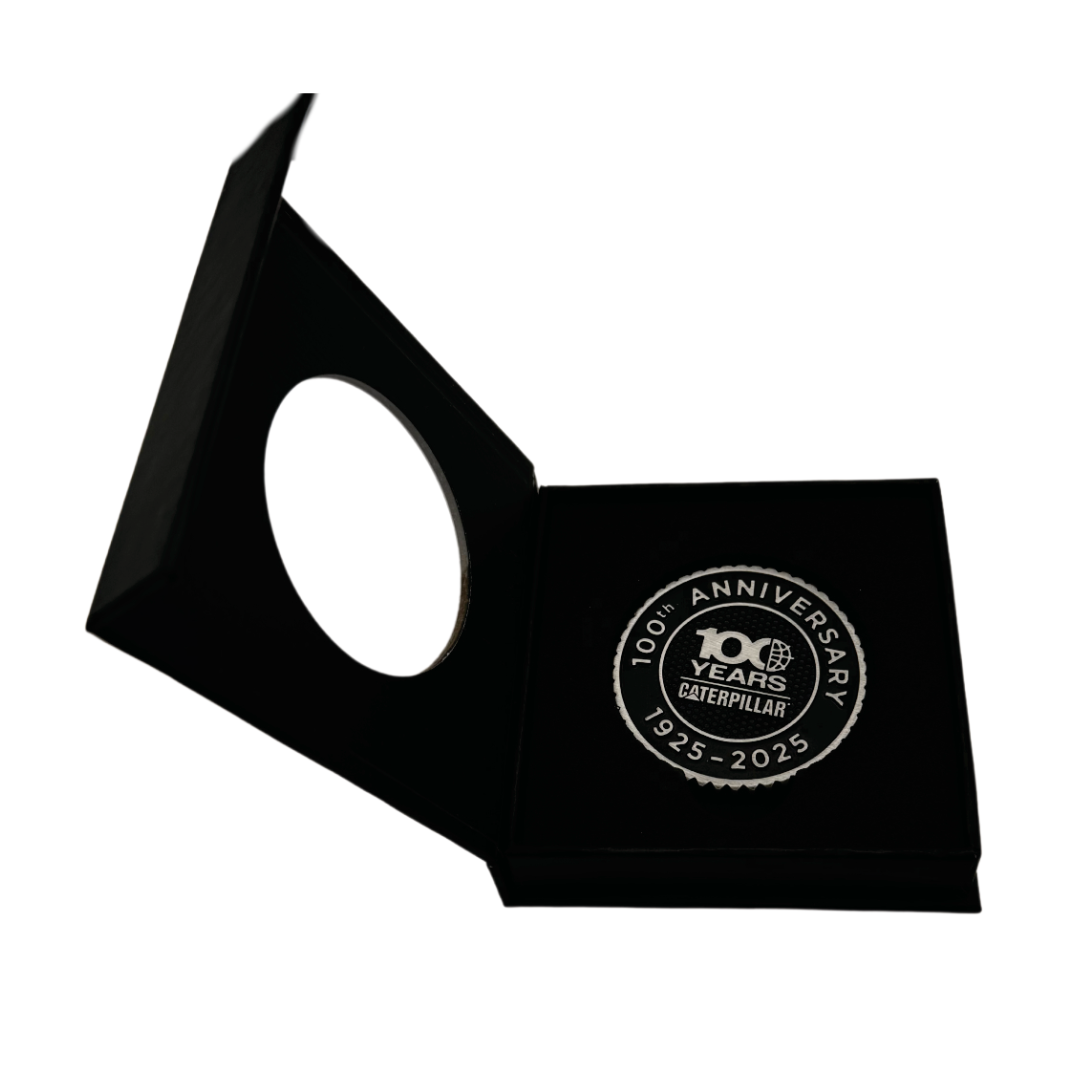 This two-sided commemorative coin showcases the centennial design on one face and a classic Caterpillar logo on the reverse. It is elegantly presented in a keepsake display box.