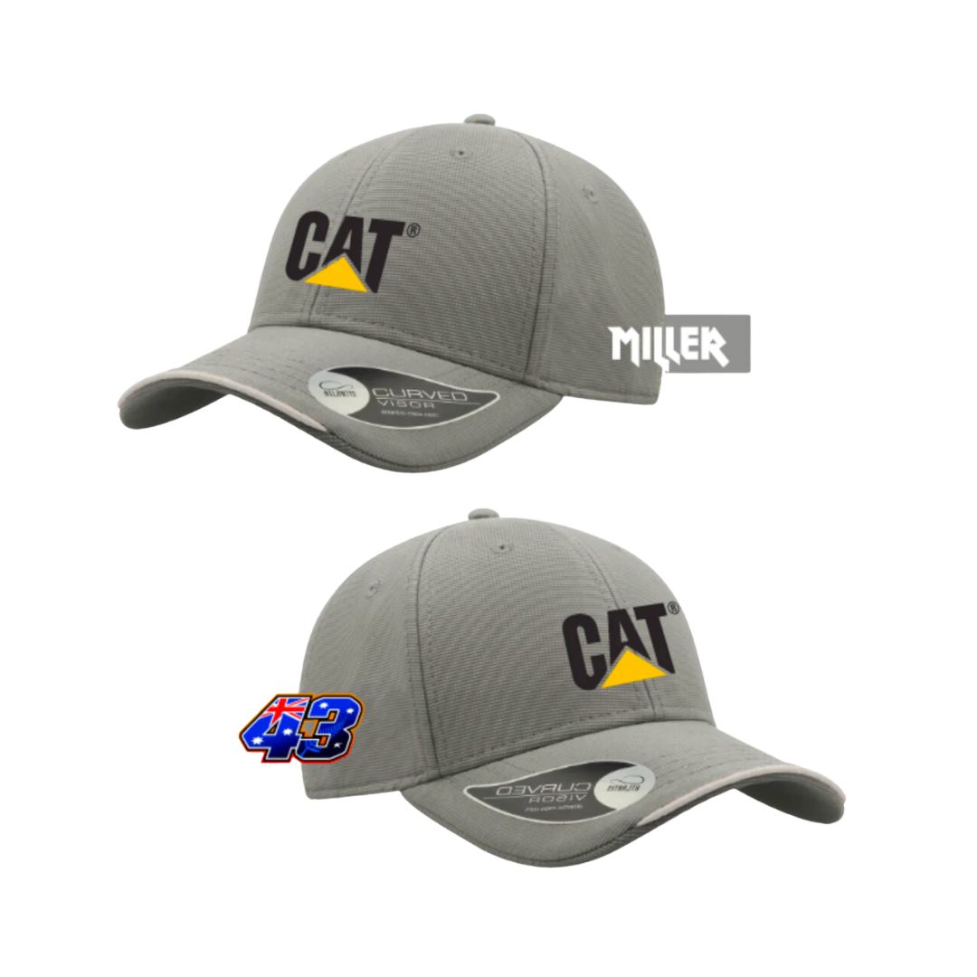A Grey 6-panel baseball cap in polyester jacquard fabric, with a contrasting piping on visor and long velcro strap closure at rear. Branded with Cat and Miller 43.